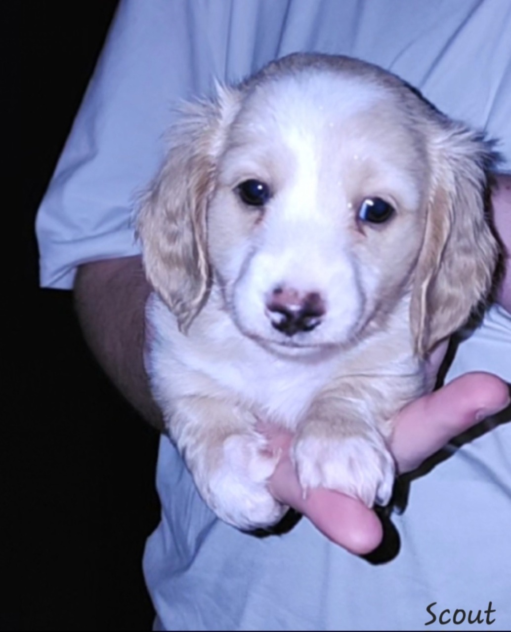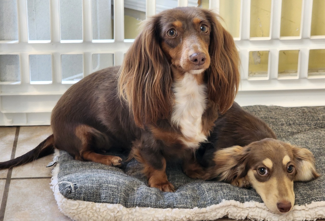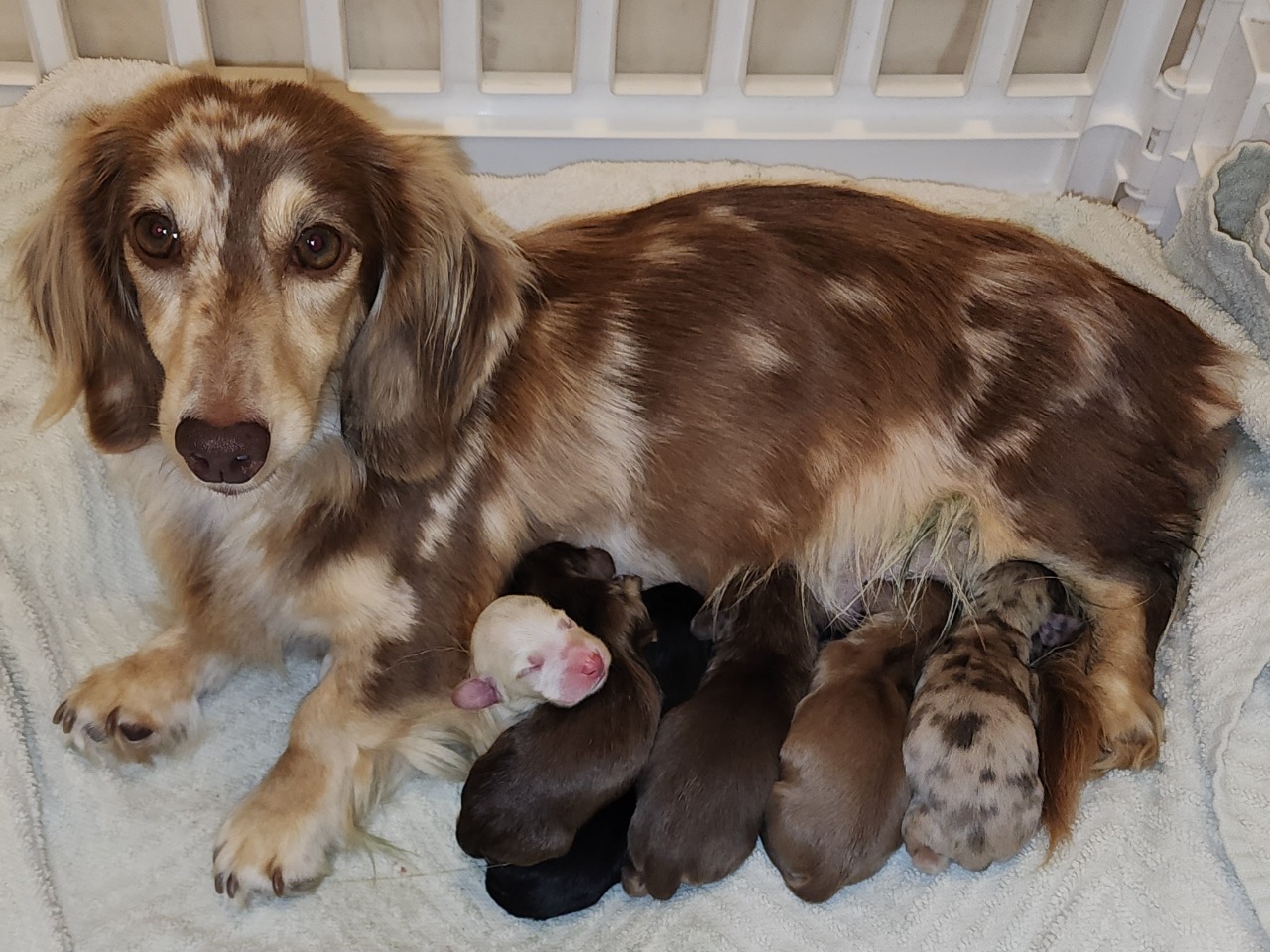 The colors I have introduced into my dachshund breeding program are black and tan, chocolate and tan, black and cream, chocolate and cream, and creams. I breed only long coats now. The patterns that I have are solid, piebald, and dapple.